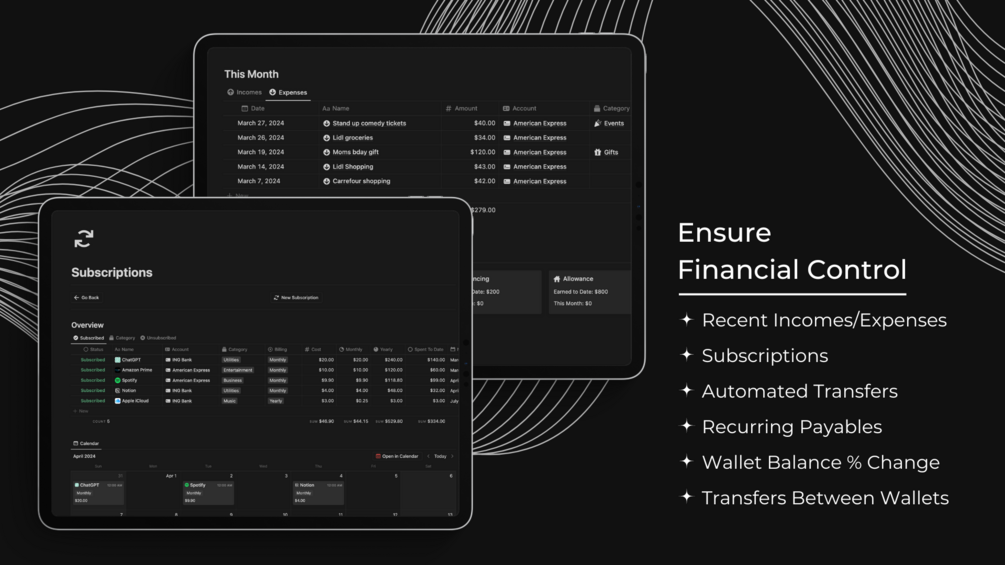 - Subscriptions → track all of your subscriptions costs;