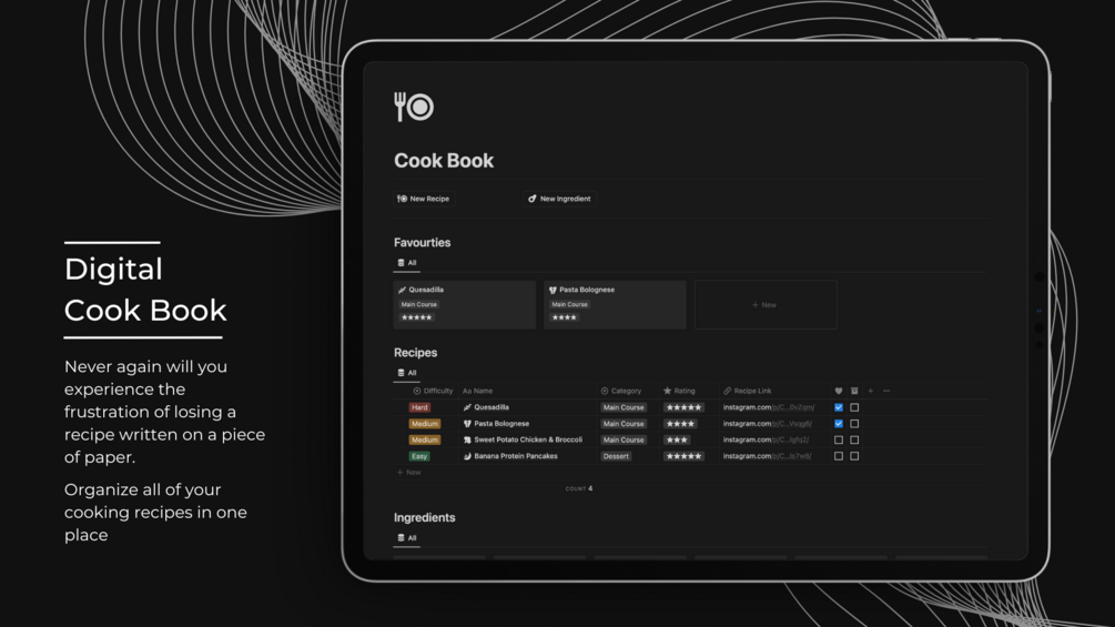 That's where the Cook Book template comes in handy. With this solution, you can easily gather all your ingredients and create new recipes, conveniently storing them in one central location.