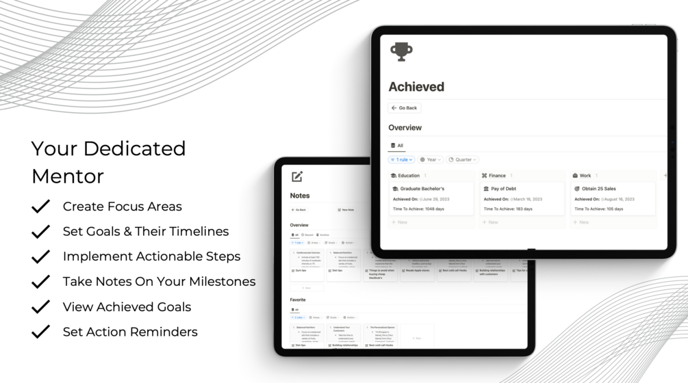 Start achieving your goals by visualising your path, tracking actionable steps, and celebrating milestones. Check off each accomplishment and see your successes add up over time.